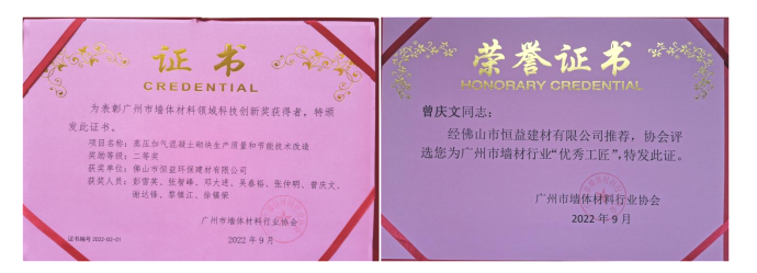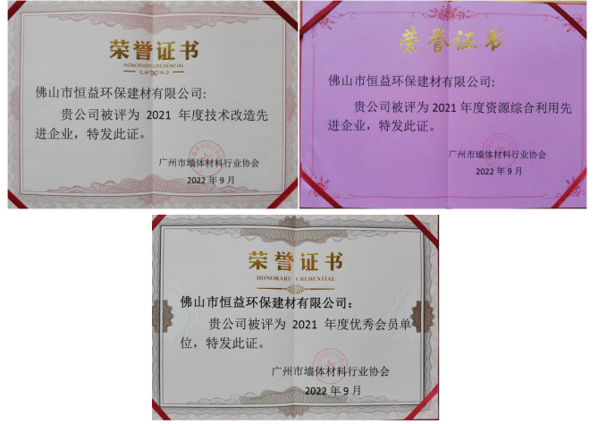 9月27日,經(jīng)廣州市墻體材料協(xié)會(huì)評(píng)選,佛山市恒益環(huán)保建材有限公司榮獲“2021年度技術(shù)改造先進(jìn)企業(yè)”、“2021年度資源綜合利用先進(jìn)企業(yè)”、“2021年優(yōu)秀會(huì)員單位”榮譽(yù)稱號(hào),“蒸壓加氣混凝土砌塊生產(chǎn)質(zhì)量和節(jié)能技術(shù)改造” 研發(fā)項(xiàng)目獲科技創(chuàng)新二等獎(jiǎng),員工曾慶文同志獲廣州市墻材行業(yè)“優(yōu)秀工匠”稱號(hào)。