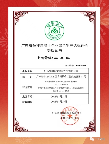 3月11日,經(jīng)廣東省預(yù)拌混凝土行業(yè)協(xié)會(huì)、佛山市住房和城鄉(xiāng)建設(shè)局及佛山市建筑業(yè)協(xié)會(huì)專家組現(xiàn)場(chǎng)考察審定通過,廣東粵構(gòu)新型建材產(chǎn)業(yè)有限公司正式評(píng)定為“綠色生產(chǎn)三星級(jí)達(dá)標(biāo)企業(yè)”,頒發(fā)《廣東省預(yù)拌混凝土企業(yè)綠色生產(chǎn)達(dá)標(biāo)評(píng)價(jià)等級(jí)證書》。