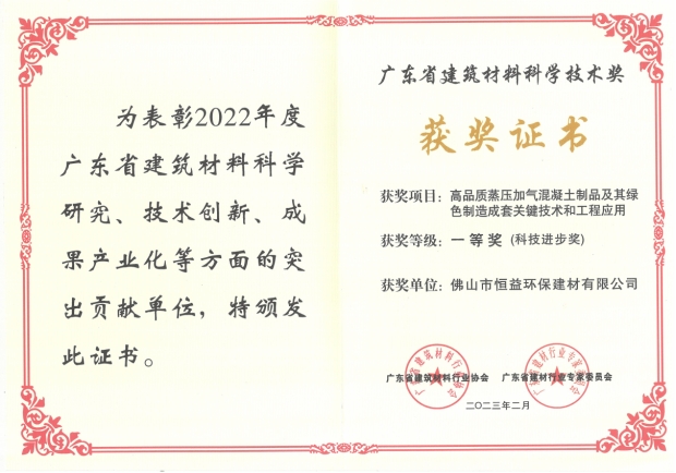 近日,廣東省建材行業(yè)高質(zhì)量發(fā)展會(huì)暨廣東省建筑材料行業(yè)協(xié)會(huì)第五屆一次會(huì)員大會(huì)在佛山舉行。恒益環(huán)保建材公司項(xiàng)目成果“高品質(zhì)蒸壓加氣混凝土制品及其綠色制造成套關(guān)鍵技術(shù)和工程應(yīng)用”被授予“廣東省建筑材料科學(xué)技術(shù)獎(jiǎng)一等獎(jiǎng)”稱號(hào)!與此同時(shí),還獲得了“綠色制造優(yōu)秀企業(yè)”“科技創(chuàng)新優(yōu)秀企業(yè)”“質(zhì)量標(biāo)準(zhǔn)品牌建設(shè)先進(jìn)個(gè)人”等多項(xiàng)集體及個(gè)人榮譽(yù)。