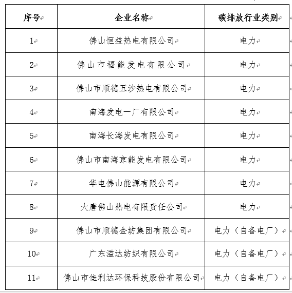 表1 佛山納入全國碳排放權(quán)交易市場配額管理重點排放單位名單